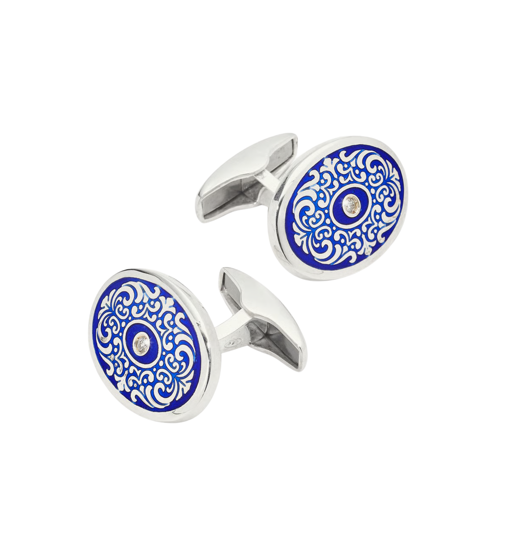 Sterling Silver Engraved Enamel Cufflinks with Diamonds